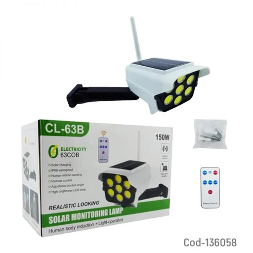 پروژکتور دوربینی خورشیدی 150 وات مدل CL-63B یک پروژکتور قابل شارژ است که دارای پنل خورشیدی بوده و با نور خورشید شارژ می شود.محتویات جعبه این نورافکن خورشیدی شامل پایه و کنترل و خود پروژکتور می باشد.این پروژکتور دارای سنسور حرکت است و با حرکت در مقابل آن به طور خودکار روشن می شود و می توان آن را برای امنیت استفاده نمود.